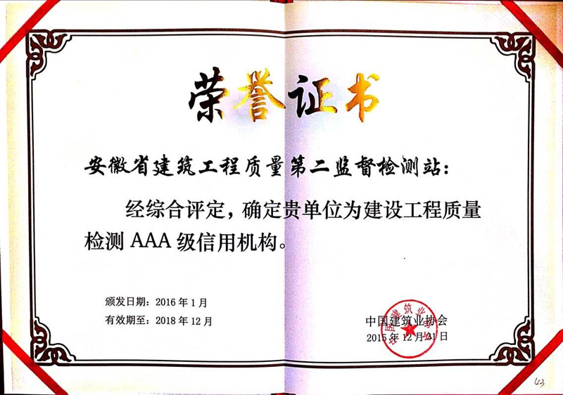 近日,安徽省建筑工程質(zhì)量第二監(jiān)督檢測(cè)站順利通過(guò)中國(guó)建筑業(yè)協(xié)會(huì)審批,榮獲建設(shè)工程質(zhì)量檢測(cè)機(jī)構(gòu)信用等級(jí)最高評(píng)價(jià)——“建設(shè)工程質(zhì)量檢測(cè)AAA級(jí)信用機(jī)構(gòu)”榮譽(yù)稱號(hào)。