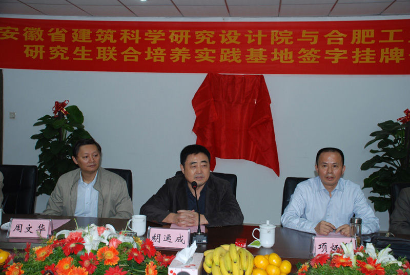 集團公司董事長、黨委書記胡運成向?qū)嵺`基地的掛牌表示祝賀,向徐樅巍校長一行介紹了安徽建工集團的發(fā)展歷程以及安徽建工實施“脫胎換骨、二次創(chuàng)業(yè)”以來所取得的主要成績。胡運成同志指出:校企合作是國家所倡導(dǎo)的人才培養(yǎng)新模式。多層次、全方位、多角度的校企合作對建科院解放思想,吸收新血液、新知識有很好的促進作用。建科院要以此為契機加強與工大等高校的合作,著力提升企業(yè)科技創(chuàng)新水平,積極推動安徽省建設(shè)事業(yè)的發(fā)展。