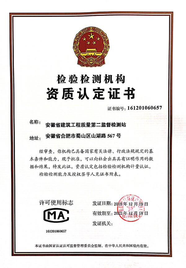 經(jīng)前期現(xiàn)場(chǎng)評(píng)審,安徽省質(zhì)量技術(shù)監(jiān)督局最終審核認(rèn)定安徽省建筑工程質(zhì)量第二監(jiān)督檢測(cè)站已具備國(guó)家有關(guān)法律、行政法規(guī)規(guī)定的基本條件和能力,可以向社會(huì)出具具有證明作用的數(shù)據(jù)和結(jié)果,并于2016年12月19日頒發(fā)了檢驗(yàn)檢測(cè)機(jī)構(gòu)資質(zhì)認(rèn)定證書(證書編號(hào):161201060657)。