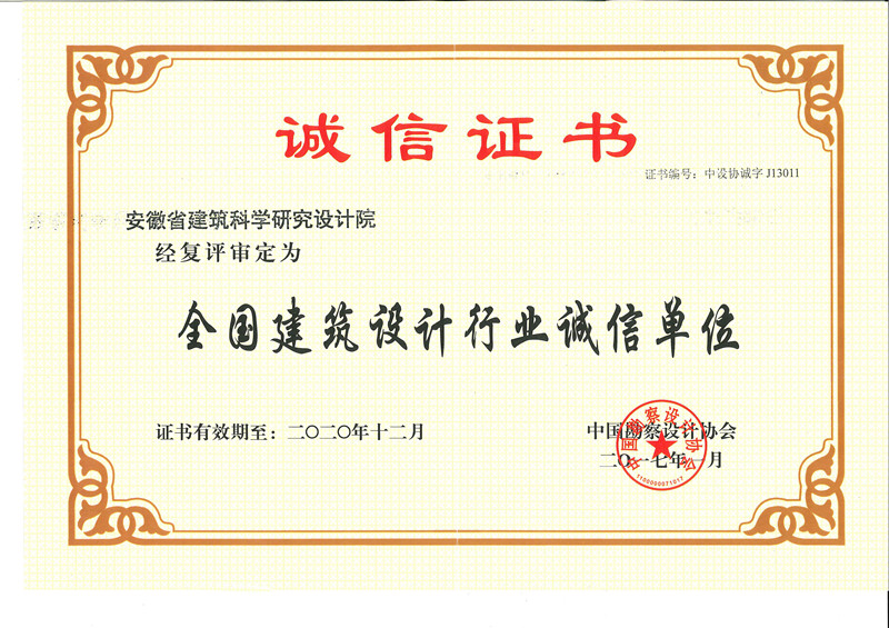 自2013年首次被評為“全國建筑設(shè)計(jì)行業(yè)誠信單位”企業(yè)以來,我院始終自覺遵守工程建設(shè)相關(guān)法律、法規(guī),堅(jiān)持“誠實(shí)經(jīng)營”、”守信經(jīng)營”,在今年安徽省建設(shè)工程勘察設(shè)計(jì)企業(yè)建筑市場信用評級中名列前茅,并得到中國勘察設(shè)計(jì)協(xié)會(huì)的認(rèn)可。