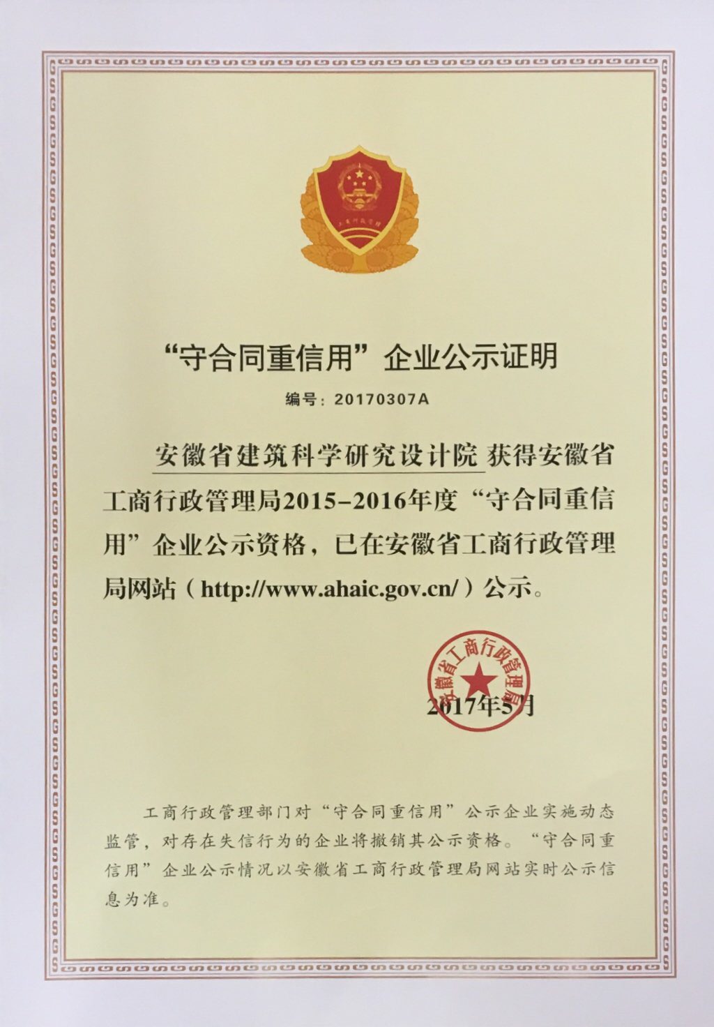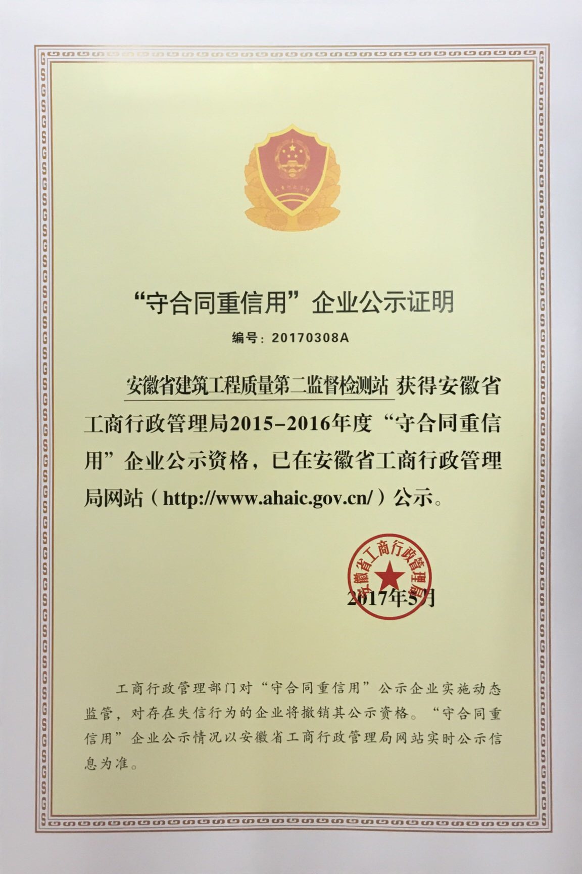 近日,經(jīng)安徽省工商行政管理局評定公示,院、二站榮獲2015-2016年度省級“守合同重信用”企業(yè)榮譽(yù)稱號。