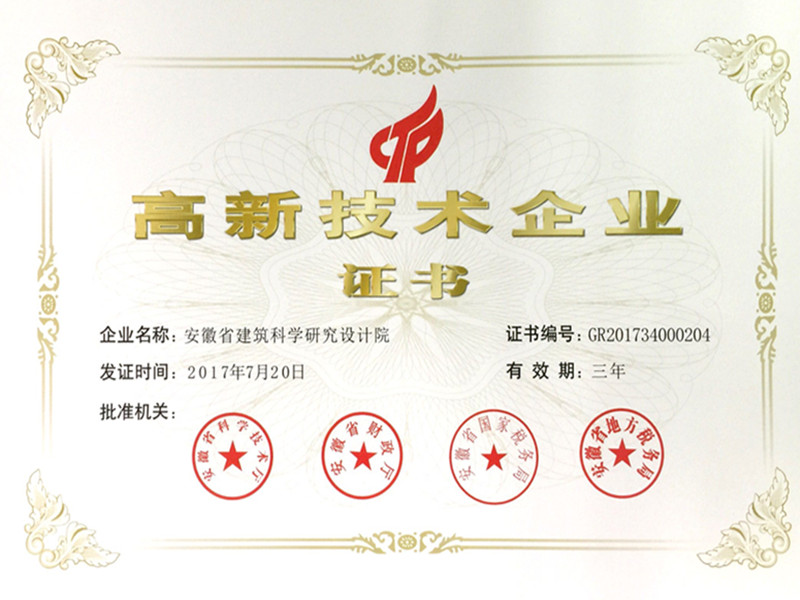 金秋時節(jié),安徽省建筑科學研究設計院繼2008年、2011年、2014年后,再次收獲“國家級高新技術企業(yè)”榮譽稱號。高新技術企業(yè)由安徽省科學技術廳、安徽省財政廳、安徽省國家稅務局、安徽省地方稅務局聯(lián)合頒發(fā)的《高新技術企業(yè)證書》(證書編號:GR201734000204),發(fā)證時間為2017年7月20日,有效期三年。