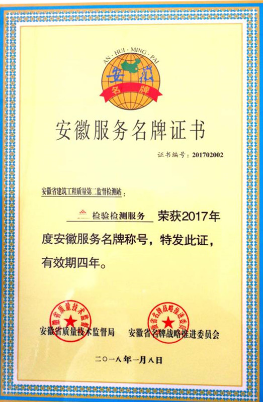 根據(jù)《安徽名牌評定管理辦法》有關(guān)規(guī)定,經(jīng)申報、安徽省質(zhì)量技術(shù)監(jiān)督局、安徽省名牌產(chǎn)品戰(zhàn)略推進委員會嚴格審核,二站順利通過“安徽名牌產(chǎn)品”資格復(fù)審,榮獲2017年度安徽服務(wù)名牌稱號(證書編號:201702002),有效期四年。