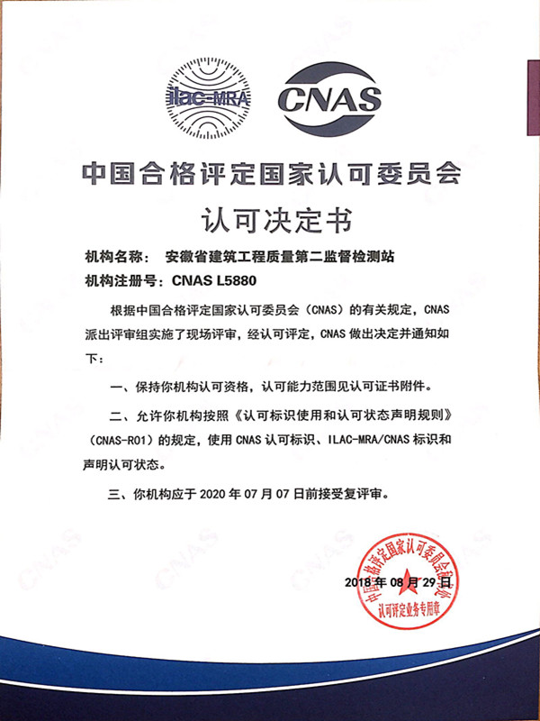 近日,中國(guó)合格評(píng)定國(guó)家認(rèn)可委員會(huì)(CNAS)官網(wǎng)正式公布安徽省建筑工程質(zhì)量第二監(jiān)督檢測(cè)站實(shí)驗(yàn)室通過CNAS實(shí)驗(yàn)室復(fù)評(píng)審工作,再次獲得中國(guó)合格評(píng)定國(guó)家認(rèn)可委員會(huì)認(rèn)可決定書。