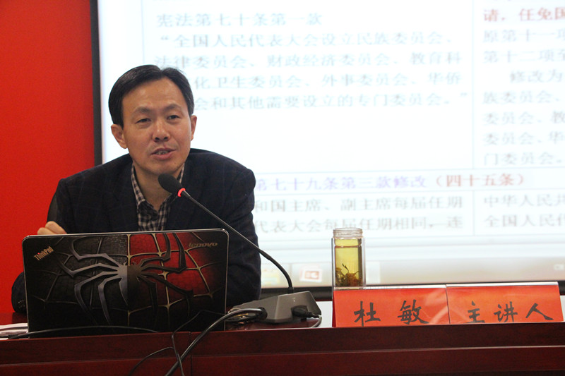 隨后,杜敏教授圍繞《憲法》、《監(jiān)察法》和《中國共產(chǎn)黨紀(jì)律處分條例》等黨內(nèi)法規(guī),深入淺出地闡述了中國憲法制定及修改的歷史脈絡(luò)、2018年憲法修改的主要內(nèi)容以及監(jiān)察法和黨內(nèi)法規(guī)若干問題等內(nèi)容,整場報(bào)告主題明確,內(nèi)容豐富,脈絡(luò)清晰,既有很強(qiáng)的政策理論性,又有重要的實(shí)踐指導(dǎo)性,對提升國有企業(yè)工作人員法治觀念,增強(qiáng)國有企業(yè)改革發(fā)展法治基礎(chǔ)具有重要的指導(dǎo)意義。