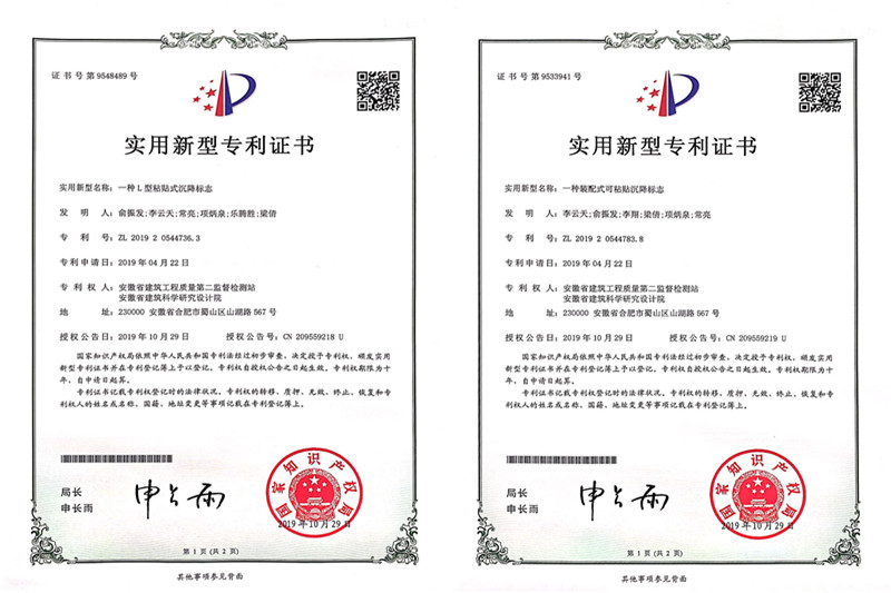 日前,由二站道橋檢測所主持研發(fā)的“一種裝配式可粘貼沉降標志”、“一種L型粘貼式沉降標志”喜獲兩項“實用新型專利證書”(專利號ZL 2019 2 0544736.3、ZL 2019 2 0544783.8)。