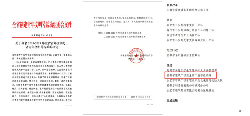 近日,從安徽省住建廳創(chuàng)建青年文明號活動組委會傳來喜訊,安徽建科質(zhì)檢二站被命名為2018-2019年度 “青年文明號標(biāo)兵”榮譽(yù)稱號,在二站榮譽(yù)墻上再添一抹青春色彩。