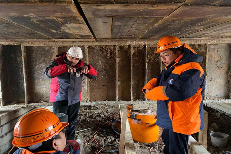 二站巖土分院作為承接單位,對該項(xiàng)目高度重視,前期與上海建工就技術(shù)問題進(jìn)行了充分溝通,制定了全面而細(xì)致的檢測方案,在當(dāng)?shù)刂谱髁虽摿?、配重等大型設(shè)備,以確保檢測現(xiàn)場能夠順利實(shí)施,同時(shí)于2019年12月外派強(qiáng)光玉、陳明兩位優(yōu)秀項(xiàng)目經(jīng)理長駐現(xiàn)場提供專業(yè)檢測服務(wù)。同志們克服氣候嚴(yán)寒、語言不通、水土不服的困難,不僅順利啟動(dòng)了檢測工作,而且一個(gè)月內(nèi)完成了總工作量的50%,給總包單位節(jié)約了工期,以嚴(yán)謹(jǐn)?shù)墓ぷ髯黠L(fēng)和優(yōu)質(zhì)的服務(wù)展現(xiàn)了安徽建科質(zhì)檢二站的風(fēng)采,得到了現(xiàn)場各方主體單位的一致好評,樹立了安徽建科人敬業(yè)奉獻(xiàn)、艱苦奮斗的良好職業(yè)形象。