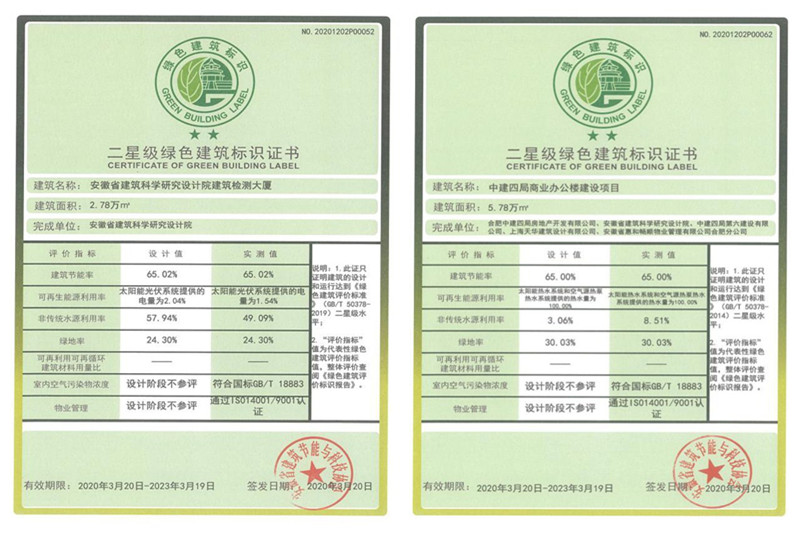 其中采用《綠色建筑評(píng)價(jià)標(biāo)準(zhǔn)》GB/T 50378-2019進(jìn)行評(píng)價(jià)的安徽建科建筑檢測(cè)大廈,成為我省首個(gè)獲得“新國(guó)標(biāo)”運(yùn)行標(biāo)識(shí)的二星項(xiàng)目。另外由安徽建科提供綠色建筑咨詢及檢測(cè)服務(wù)的中鐵四局商業(yè)辦公樓項(xiàng)目也榮獲新標(biāo)運(yùn)行二星項(xiàng)目。