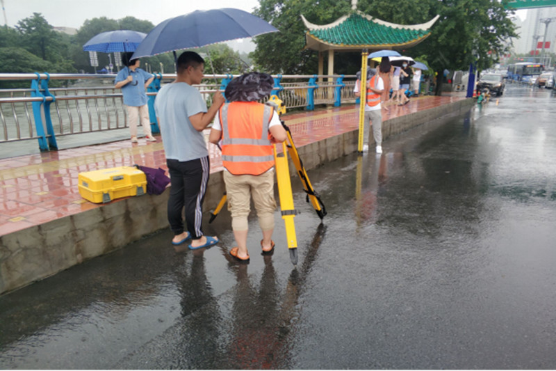 7月17日20時至19日6時,合肥市區(qū)遭受70~80年一遇的強(qiáng)暴雨襲擊,暴雨造成合肥市區(qū)多地內(nèi)澇,上游水庫泄洪,南淝河水位極速上漲,超警戒水位約2米。其中,長江路橋橋下水位超出設(shè)計洪水水位,橋梁上部結(jié)構(gòu)局部淹沒。由于該橋自重較輕,洪水通過時會對橋梁產(chǎn)生浮力和沖擊力。為確保橋梁安全,主管部門對該橋采取重車壓橋的應(yīng)急措施,并委托道橋所對過程中的變形情況進(jìn)行監(jiān)測。道橋所技術(shù)人員布設(shè)監(jiān)測點(diǎn)、采用高精度電子水準(zhǔn)儀對橋面及橋墩進(jìn)行監(jiān)測,從而判斷橋梁的豎向變形情況。監(jiān)測工作從19日上午10時開始,每小時監(jiān)測一次,持續(xù)至次日凌晨3時水位明顯回落。在確保洪水退到安全水位后,道橋所監(jiān)測人員方撤離現(xiàn)場。