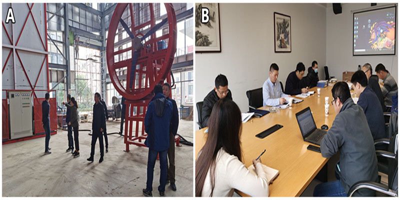 幕墻檢測(cè)設(shè)備驗(yàn)收:(A)專(zhuān)家現(xiàn)場(chǎng)勘驗(yàn)設(shè)備;(B)驗(yàn)收?qǐng)?bào)告會(huì)