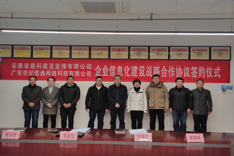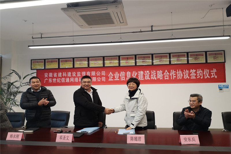 3月5日,安徽省建科建設(shè)監(jiān)理有限公司與廣東世紀(jì)信通網(wǎng)絡(luò)科技有限公司就全面開展企業(yè)信息化建設(shè)舉行簽約儀式。院黨委委員、副院長、總建筑師安東兵、建科監(jiān)理公司總經(jīng)理陳嫣君、黨支部書記高屹、廣東世紀(jì)信通網(wǎng)絡(luò)科技有限公司副總經(jīng)理、上海分公司經(jīng)理鄧圣文、副經(jīng)理鄭林洪以及相關(guān)人員出席簽約儀式。