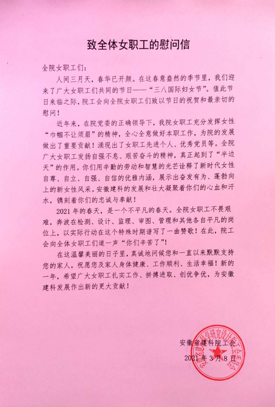 3月8日當(dāng)天,院工會通過CES協(xié)同系統(tǒng)、微信公眾號、電子屏等宣傳平臺,向全院女職工發(fā)出了慰問信和祝??ㄆ槊课慌毠べ浰土嗣倒寤?,積極營造了溫馨的濃厚節(jié)日氛圍。此次活動是院工會開展的“巾幗心向黨,建功新時代”主題系列活動之一,共有200余名女職工參與了活動。