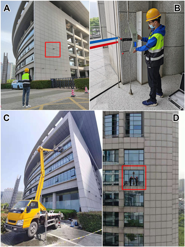 二站幕墻所承接的合肥市政務(wù)綜合樓位于東流路100號(hào),幕墻面積總計(jì)10.03萬平方米,包含短槽支承石材幕墻,背栓支承石材幕墻,明框玻璃幕墻,半隱框玻璃幕墻,全隱框玻璃幕墻,自平衡拉索玻璃幕墻,點(diǎn)支承玻璃幕墻和全玻幕墻等多種類型的幕墻。在數(shù)據(jù)采集及取樣過程中,二站幕墻所檢測(cè)人員分為無人機(jī)組、高空滑板組、登高車組以及應(yīng)急組等4個(gè)小組,按計(jì)劃有條不紊地進(jìn)行工作,至5日晚,現(xiàn)場(chǎng)工作全部完成。本次現(xiàn)場(chǎng)工作共計(jì)拆卸50余處隱蔽節(jié)點(diǎn),并全部復(fù)原,無安全事故發(fā)生,現(xiàn)場(chǎng)工作得到委托方的高度評(píng)價(jià)。