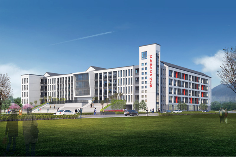 該項(xiàng)目位于皖南地區(qū),石臺(tái)縣城東新區(qū),整體建筑風(fēng)格采用徽派建筑的黑白灰元素及坡屋頂。設(shè)計(jì)過(guò)程中充分考慮紅色主題,以坡屋頂結(jié)合山墻面圍合形成五邊形來(lái)呼應(yīng)五角星的五邊形輪廓,包括西側(cè)作為校區(qū)形象主入口采用五邊形的出入口門(mén)廳,地面五角星的鋪裝,主入口廣場(chǎng)上設(shè)置的劉少奇的塑像,處處彰顯紅色元素。采用粉墻黛瓦、冰裂紋的花格窗等徽派建筑的典型元素,彩色的絲帶穿插與建筑,使得建筑不再沉悶,結(jié)合“庭院”式的平面布局,體現(xiàn)“書(shū)院”的文脈氣息。