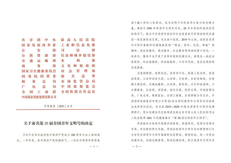此次命名表彰由共青團中央、最高人民法院、發(fā)展改革委、工業(yè)和信息化部、公安部等23家全國創(chuàng)建青年文明號活動組委會成員單位開展,經(jīng)綜合考察、逐級推報、集中審核、社會公示等程序評選產(chǎn)生。