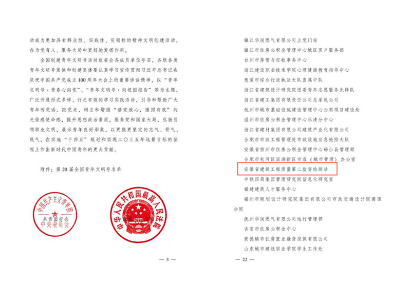 近日,第20屆全國青年文明號集體評選結果揭曉,安徽省建筑工程質(zhì)量第二監(jiān)督檢測站(簡稱安徽建科質(zhì)檢二站)被命名為“第20屆全國青年文明號”榮譽稱號。