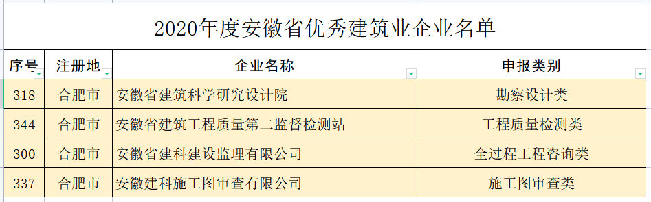 近日,安徽省住建廳官網(wǎng)發(fā)布了“2020年度安徽省優(yōu)秀建筑業(yè)企業(yè)”名單,安徽建科及其所屬子公司質(zhì)檢二站、建科審圖、建科監(jiān)理光榮上榜?!?020年度安徽省優(yōu)秀建筑業(yè)企業(yè)”由安徽省住建廳、交通廳、水利廳首次聯(lián)合評(píng)定。