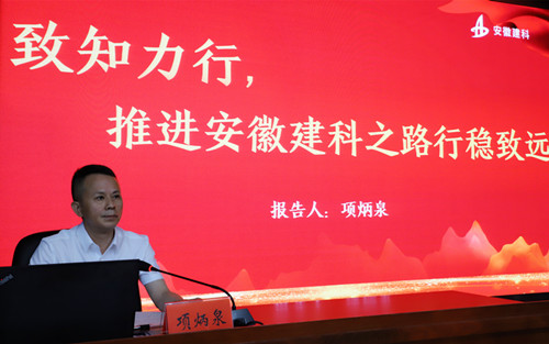 項炳泉在講話暨黨課報告中,代表安徽建科黨委,向受表彰人員表示熱烈祝賀,向奮戰(zhàn)在各個崗位上的全體共產(chǎn)黨員致以節(jié)日的問候。他圍繞安徽建科的四個歷史時期、企業(yè)發(fā)展概況、企業(yè)轉(zhuǎn)型發(fā)展、安徽建科企業(yè)文化、干部隊伍素質(zhì)存在的不足和干部素質(zhì)提升路徑等6個方面作了題為《致知力行,推進(jìn)安徽建科之路行穩(wěn)致遠(yuǎn)》的黨課報告。