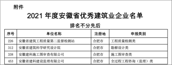 3月3日,安徽省住房和城鄉(xiāng)建設(shè)廳發(fā)布了“2021年度安徽省優(yōu)秀建筑業(yè)企業(yè)”名單,安徽省建科院及所屬子公司質(zhì)檢二站、建科審圖、建科監(jiān)理同時(shí)上榜。